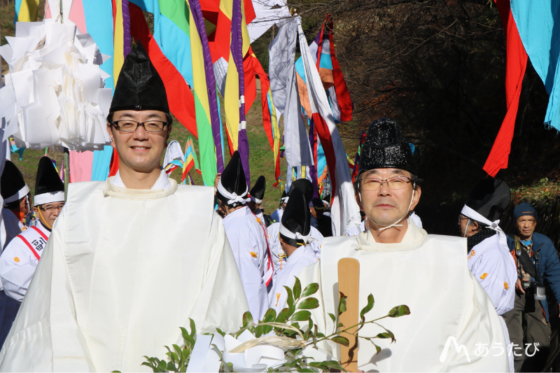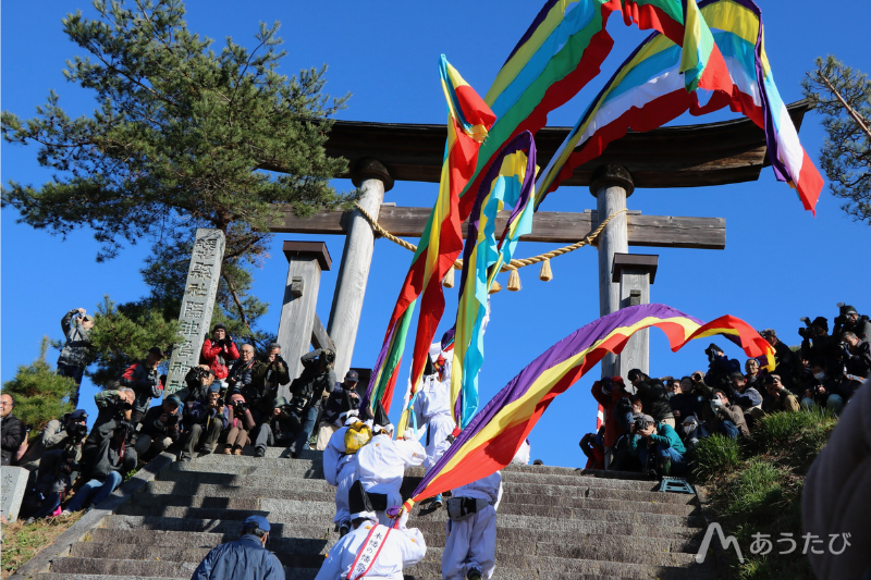 | 08:00 | Kohata Banner Festival begins. Each dosha (community group) carries its handmade banner and heads toward Okitsushima Shrine at the top of the mountain. The banners are quite heavy, so participants take turns carrying them. Opening Ceremony (Shuttatsu-shiki) – Purification ritual (shubatsu) – Greeting from the festival commander – Address from the shrine priest – Remarks from invited guests Procession Carry banners while walking toward the shrine at the mountain summit. The route takes about three hours on foot, so comfortable walking shoes are recommended. Sacred sake will be offered frequently along the way. Please feel free to drink at your own pace. Note: Those driving a car must not consume alcohol. Takatoreba area Visit Hayama Shrine and observe rituals such as Tainai Kuguri, a traditional passage-through-the-rock ceremony. Closing Ceremony Prayer at Okitsushima Shrine followed by three celebratory shouts of Banzai. | |